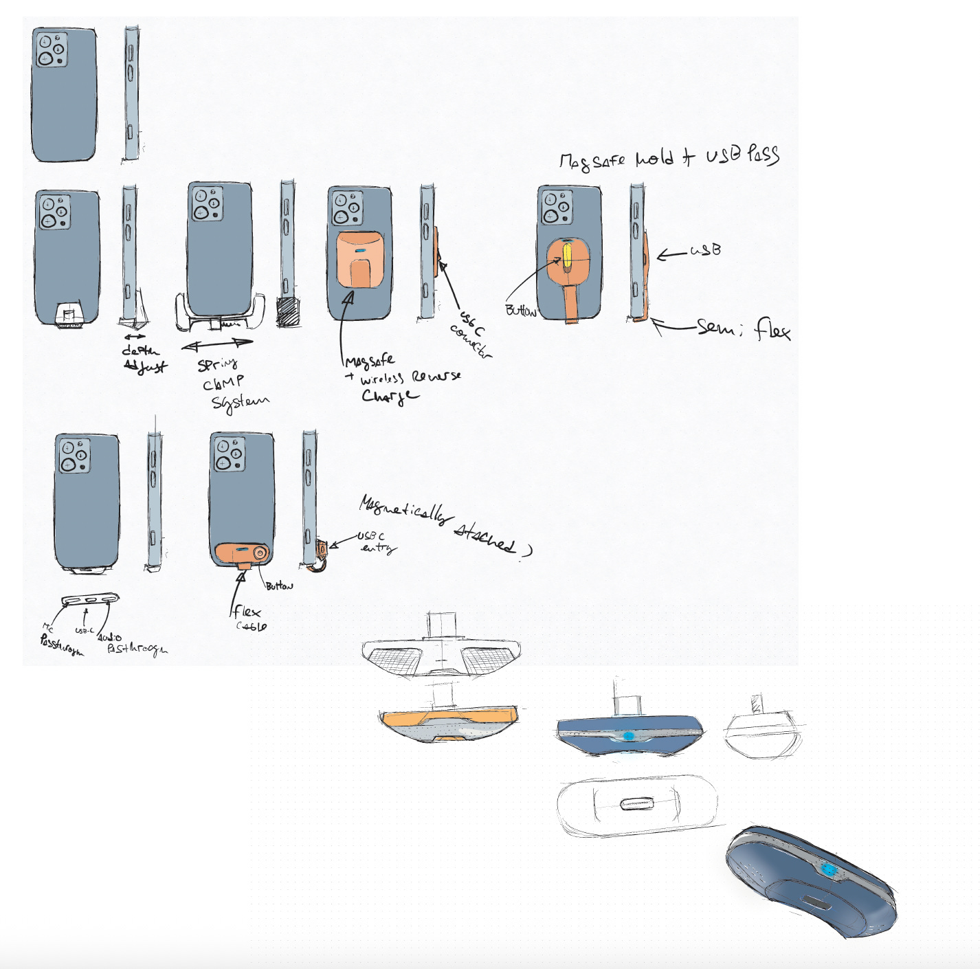 Form factor & pass-through: Bud lives under the phone, featuring a pass-through USB-C port (for charging and CarPlay). The connector height sets the geometry; we locked it early for pocketability and comfort.